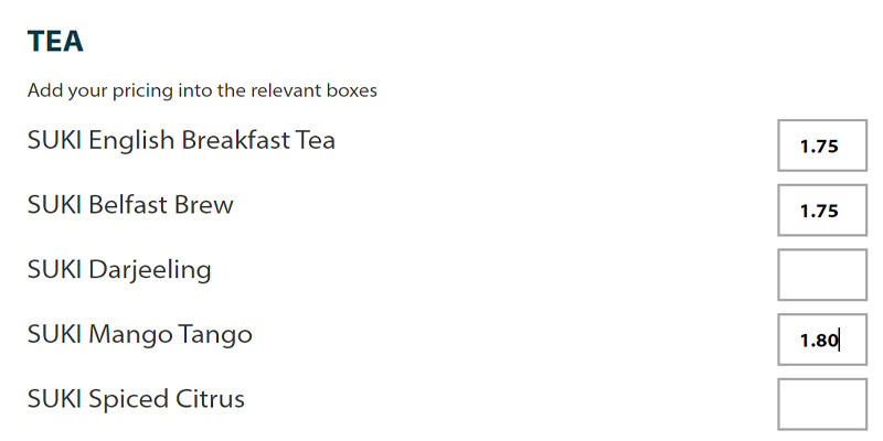 Next, you’ll find all our SUKI and Pavilion Tea flavours listed. Add your pricing into the boxes next to the teas you serve. Any left blank will not appear on your final menu.